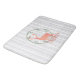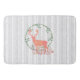 Eine Badematte mit coolem boho-Stil, digitales Aquarelldesign. Eine pastellorangefarbene Rentiere-Silhouette in einem Kranz von Kräutern-Blätter. Pilze und Waldfarne zu seinen Füßen. Ein grauweißes Birkenbaummuster im Hintergrund.