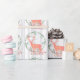 Umhüllungspapier mit coolem boho-Stil, digitales Aquarelldesign. Eine pastellorangefarbene Rentiere-Silhouette in einem Kranz von Kräutern-Blätter. Pilze und Waldfarne zu seinen Füßen. Ein grauweißes Birkenbaummuster im Hintergrund.