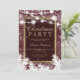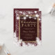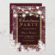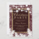 Ein rustikales Weihnachtsfest-Party mit Schneeflocken-Illustration, weiße Saitenleuchten mit weißen Kiefernästen auf rotem Hintergrund mit eleganter Schriftzeichen-Typografie.