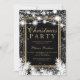 Ein rustikales Weihnachtsfest-Party mit Schneeflocken-Illustration, weiße Saitenleuchten mit weißen Kiefernästen auf schwarzem Hintergrund mit eleganter Schriftzeichen-Typografie.