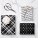 Das rustikale, moderne Geschenkverpackungs-Set verfügt über drei aufeinander abgestimmte Packpapierblätter: Schwarz-Weiß Tartan kariert, Weiß mit schwarzem Schriftzeichen "Frohe Weihnachten" Text, Schwarz mit kleinen weißen Kiefernbäumen Muster.