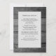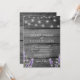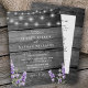 Rustikaler Holzdruck mit Lavendel und weißen Saitenleuchten Einladung zur Hochzeit mit Details im Hintergrund.