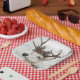 Dieser festliche Teller zeigt eine rustikale Darstellung eines Rentiers mit einem Kiefer- und Rotweinkranz auf seinen Geweihen. Der Hintergrund hat ein Vintages, strukturiertes Aussehen mit handgeschriebenem Skript, und "Frohe Weihnachten" wird in fett rotem Text angezeigt. Ideal, um Ihre Weihnachtszeit mit einer gemütlichen Touch zu bereichern.