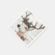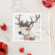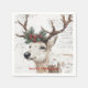 Diese festliche Serviette zeigt eine rustikale Darstellung eines Rentiers mit einem Kiefer- und Rotweinkranz auf seinen Geweihen. Der Hintergrund hat ein Vintages, strukturiertes Aussehen mit handgeschriebenem Skript, und "Frohe Weihnachten" wird in fett rotem Text angezeigt. Ideal, um Ihre Weihnachtszeit mit einer gemütlichen Touch zu bereichern.