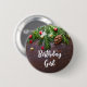 Geburtstagsknopf mit rustikalem Foto eines braunen Holztisches mit Pineconen, Kiefernnadeln, Schnee und Weihnachtsschmuck. Feierlich und schön.