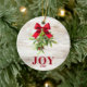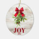 Feiern Sie die Ferien mit diesem eleganten rustikalen Weihnachtsschmuck mit dem Wort JOY in fett roter Schrift, mit einem Hauch von Mistletoe mit festlichem roten Bogen. Das Design liegt vor einem weiß gekalkten Holzboden und verleiht dem Haus ein gemütliches Ambiente. Passen Sie mit dem Jahr ein, um es zu einem zeitlosen Sake für Ihren Weihnachtsbaum oder als nachdenkliches Geschenk für Familie und Freunde zu machen.