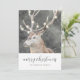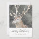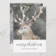 Ein ruhiger Winterschnee im Winter mit leuchtenden Saitenlichtern auf seinen Geweihten und frohe Weihnachten in einem Drehbuch-Schriftart. Eine stilvolle, moderne rustikale Grußkarte für den Urlaub.