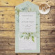 EBENFALLS IN STILEN OHNE ABENDESOPTIONEN ODER MIT QR CODE VERFÜGBAR. Diese Hochzeitseinladung verströmt mit ihren zarten Designelementen einen eleganten Charme. Vor dem Hintergrund eines lichtdurchfluteten Salbei-Grüns, vermittelt die Einladung eine ruhige Atmosphäre und schafft eine beruhigende und ruhige Atmosphäre. Der grüne Hintergrund ist leicht weiß und verleiht dem Ganzen eine Touch Vintager Eleganz. Im Mittelpunkt der Einladung steht ein zentriertes weißes Textfeld, das als Brennpunkt dient. Die unberührte, weiße Farbe des Textfelds schafft einen auffallenden Kontrast zur ruhigen grünen Kulisse und sorgt für Klarheit und Eleganz. Um das Textfeld herum ist ein Rahmen mit exquisitem botanischen Aquarell verziert. Die aufwändigen botanischen Elemente werden fachgerecht gefertigt und verleihen dem Design eine natürliche Touch und ein Gefühl der Verzauberung. Diese zarten Details im Grünen gehen über den Rahmen hinaus und reichen anmutig bis ins Äußere der Einladung, als ob die Natur sich den Anlass zu eigen gemacht hätte. Insgesamt präsentiert sich die Hochzeitseinladung in einer harmonischen Mischung aus hellweiss grün, bedrücktem Weiß und zartem botanischen Aquarell. Seine zeitlose Schönheit und Liebe zum Detail versprechen, die Gäste zu bezaubern und den Ton für eine zauberhafte und unvergessliche Hochzeitsfeier Set. Erstellt von der einfachen Farmhouse Press.