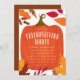 Rustikaler Erntedank/freundliches Abendessen mit einem charmanten Kürbis umgeben von bunten Herbstblättern und Eichen in Orange-, Braun-, Grün-, Gelb- und Rottönen. Die Details zum Abendessen werden in weißem Text mit "Friendsgiving Dinner" in handgeschriebenem Schriftart-Stil dargestellt. Die Einladung kehrt sich um, um einen strukturierten braunen Hintergrund anzuzeigen. Nutzen Sie diese festliche Einladung für Erntedank-Dinners, Friendsgiving-Feiern und vieles mehr!