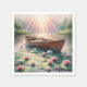 Eine ruhige Seeszene bei Sonnenaufgang mit einem hölzernen Ruderboot, umgeben von blühenden rosa und weißen Seerosen