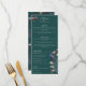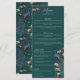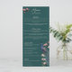 Dieses rustikale und moderne Hochzeitsmenü bietet handgezeichnet "Chinoiserie-Style"-Illustrationen eines blauen und aquamarinen Pfauenvogels inmitten der Magnolia-Vegetation, die lebendige Creme und die rot-rosa Magnolia-Blume zeigen, die alle auf einem eleganten, aquamarinen grünen Hintergrund stehen. Die Rückseite ist mit einem eleganten Blumenmuster und einem Vogelmuster mit koordinierenden Illustrationen versehen. Alle Texte können bearbeitet werden. Passen Sie Ihre Hochzeitsdetails an, wie z.B. die Namen von Braut und Bräutigam, Vorspeise, Hauptgericht, Desserttisch und Getränke.