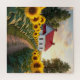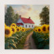 Eine malerische Szene eines malerischen weißen Bauernhauses mit einem roten Dach inmitten eines lebendigen Sonnenblumenfeldes bei Sonnenaufgang.
