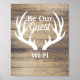 Rustikales Bauernhofposter "Be Our Guest" mit Holzplanken und weißen Hirschgeweihen. Mit einem trockenen Radiermarker können Sie Ihr WiFi-Passwort auf dem Glas rahmen und schreiben!
