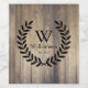 Klassische und rustikale Flaschenweinetiketten im Bauernstil mit schwarzen Weizenlaurels mit personalisiertem Monogramm und Familienname-Text auf einem Stallholzboden. Ideal für Zuhause-Winzer, Brauereien und Hochzeiten.