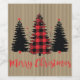 Die rustikale Bauernhausgestaltung umfasst ein Trio von Evergreen Silhouetten, eines in rotem und schwarzem Büffel kariert, das "Frohe Weihnachten" in festlichem Rot und einen Vintag gestreiften Hintergrund
