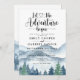 Elegante rustikale Wasserfarbengebirge und Waldszene Hochzeitsessen, mit üppig blauen und grünen Proben und Bergen mit einem Skripttext: lass das Abenteuer beginnen. Für diejenigen, die eine romantische, traumhafte Waldlandschaft Liebe haben, ist die Feier und Feier ein unvergessliches Erlebnis. Die vollständige Sammlung der für dieses Design passenden Materialien finden Sie unter: https://www.zazzle.com/collections/rustic_forest_mountain_wedding-119965625201006103