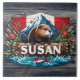 Ein kanadischer Biber mit prominenten Zähnen Erholungen auf einem Holzschild, umgeben von Blume, Wasser und einer Bergkulisse mit Nationalflagge.