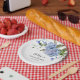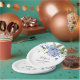 Rustikale Brautparty-Papiertafel zum Thema Blumen mit Aquarellbildern von blauen Pfirsichen und Grünpflanzen.