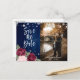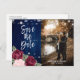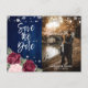 Das Foto ist in rustikalem Marineblau, Bordeaux und Rosa gehalten und Save the Date mit einer Postkarte mit bordeauxroten und blauen Rose und einem Baby-Atem auf einem Holzboden mit Saitenbeleuchtung versehen. Diese elegante, rustikale, Save the Date Postkarte wird mit Ihren Foto- und Hochzeitsdetails einfach personalisiert. Unser Foto Save the Date Postkarte ist ideal für eine marineblaue, bordeauxrote und rot-rustikale Hochzeitsfeier.