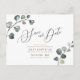 Rustikales Dusty Blue Kaugummi Eukalyptus foliage, mit eleganter moderner Kalligraphie Schrift Save the Date in Imitaten goldenen Postkarten. Copyright © 2016-2020 Bombino Designs.