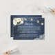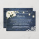 Rustikales blaues Holz weiße Blumenspitze Hochzeitsdetails Informationskarte. Rustikale Holz Mason Jar String Lights Details Beilage Karte