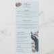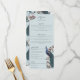 Dieses rustikale und elegante, blaue Hochzeitsmenü bietet handgezeichnet "Chinoiserie-style"-Illustrationen eines blauen und aquamarinen Pfauenvogels inmitten der Magnolienlandschaft, die lebendige Creme und blütige rosa magnolische Blume zeigen. Die Rückseite ist mit einem eleganten Blumenmuster und einem Vogelmuster mit koordinierenden Illustrationen versehen. Alle Texte können bearbeitet werden. Passen Sie Ihre Hochzeitsdetails an, wie z.B. die Namen von Braut und Bräutigam, Vorspeise, Hauptgericht, Desserttisch und Getränke.