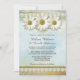 Hochzeitseinladung mit weißen Gänseblümchen auf rustikalem, lackiertem Hintergrund mit Holz und Spitzen. Schön für eine Hochzeit im Freien oder im Sommer.