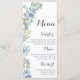 Genießen Sie Ihr Hochzeitsessen mit unserem zauberhaften Hochzeitsmenü, das von einem original Aquarellkunstwerk aus zarten staubblauen Blumen und üppigen Salbei-grünem Eukalyptus abgerundet wird. Jeder Pinselstrich zelebriert nicht nur den Geschmack, sondern spiegelt auch die Schönheit Ihrer Liebe wider. Leicht zu bearbeiten mit Ihrem einzigartigen Menü.