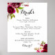 Dieses rustikale, rot-bordeauxrote Menü für Hochzeitsgetränke ist perfekt für eine moderne Hochzeit. Die Einrichtung besteht aus rosa, rot, bordeauxrot und bordfarbenen Blume mit grünem Blattwerk.