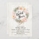 Rustikales ländliches böhmisches Braun-Duschbad Einladungskarte Design mit rosa/pfirsichfarbenen Rose und Eukalyptus-Blätter Kranz mit weißem gewaschenen Holzplättchen Hintergrund und Monogramm mit Blumenecke hinten.