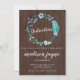 Ein aquamarines, rustikales Aquarelldesign für eine Babyweihe mit einem blauen/grünen Blumenkranz und einem dunkelholzgeschmückten Hintergrund. Der gesamte Text ist weiß und enthält "Widmung" im Kranz. Die Rückseite der Einladung ist aquamarin.