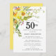 Die wunderschöne Blumenstruktur im Frühling mit gelben und weißen Daffodien. Die üppige Vegetation und die üppigen Stiele verleihen dem Hotel ein modernes Boho-Ambiente. Die Rückseite des 50. Geburtstags Einladung ist hell sonnig gelb. Perfekte Wahl für eine Geburtstagsfeier im Frühjahr.