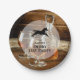 Die Papier-Teller von Derby Party verfügen über einen mit Bourbon-Whiskey gefüllten Kristalldekanter und eine Brille auf einem rustikalen Holztisch, eine Racehorse-Silhouette (Sie können das Pferd entfernen) und Ihre Party-Details in schicken Schriften. PASSENDE Artikel in unserer Sammlung.