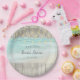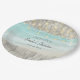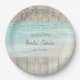 Diese rustikalen Brautparty-Papier-Teller an der Küste sind aus verwittertem Holz mit einer Szene von Meereswellen, die am Strand im Hintergrund abstürzen, mit Lichtern an der Spitze.