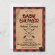 Dieses Design verfügt über einen roten Büffel-karierten und Einfallsgrund mit niedlichen Waldtieren und lustigen Drehbüchern. Einfach mit Ihrer Babydusche-Information personalisieren.