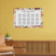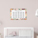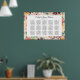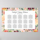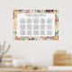 Das stilvolle Hochzeitsplakatdesign beinhaltet ein Monogramm der Braut- und Bräutigamen sowie das Hochzeitsdatum, einen individuellen Vorlagentext für Tischnummern und Gastnamen. Gerahmt durch die beige Blume von Sommer und Herbst, Rose, Dahlien, Blume aus Birnen und Pfirsichblättern und die üppige Vegetation, in einer herrlichen Herbstpalette in Bordeaux, Gelb, Pfirsichorange, Rosa und Grüntönen.