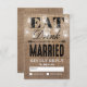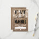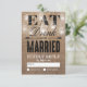 Diese skurrilen Landheiratskarten sind ein passendes Set mit einem rustikalen braunen Burleffekt-Hintergrund, elegantem Mason-Weiß-Strick-Tinkle-Leuchten, den Begriffen "EAT, DRINK UND SEIN VERHEIRATET" und den Details Ihrer Hochzeitsantwort.