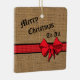 Imitate Burlap Muster, mit einem Vintagen Bogen fertig, sitzend auf roten karierten Band. Weihnachtskritik drückt allen Frohe Weihnachten aus. Verlass, wie es ist, oder ändere den Text, um mit deinen Gefühlen der Saison zu personalisieren. Auf der Rückseite können Sie mit dem Namen und dem Datum Ihrer Familie personalisieren.