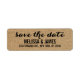 Beige Rustikale Burlap-Skript Hochzeit Speichern Sie das Datum Rücksendeadresse-Label. Design von Elke Clarke© für MonogramGallery, gedruckt von Zazzle. Versenden Sie Ihre Datumskarten an Ihre Freunde und Familie mit diesem wunderschönen, einfachen Etikett mit den Worten "Save the Date" in einem Text-Overlay mit schwarzer Schrift. Foto-Effekt auf beige Einbruchhöhe. Andere Farben sind verfügbar.