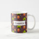 Kaffeemaschine mit einem lustigen Camping-Motiv-Tasse. Set auf rötlich-braunem Hintergrund. Elemente im Muster sind ein Lagerfeuer, ein Zelt, Gitarre, Schaufel und Rucksack. Personalisieren Sie mit einem Namen über einem Rahmen in der Form eines weißen Band.