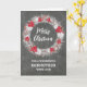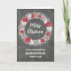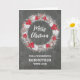 Frohe Weihnachten für die Godmaterkarte mit rustikalem Country Chalkboard Muster und schneebedeckten Kranz mit Poinsettias.