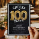 Feiern Sie mit 100! Diese 100. Geburtstagsfeier lädt mit dem Titel "Feiern bis 100 Jahre!" ein. Mit einem rustikalen Chalkboard-Hintergrund, Gold Nummer 100 Helium-Ballons, trendiger weißer Typografie und einer einfachen Geburtstagsgeschenk-Vorlage, die leicht zu anpassen ist.
