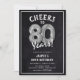 Feiern Sie ab 80! Diese 80. Geburtstagsfeier lädt mit dem Titel "Cheers to 80 Years!" ein. Mit einem rustikalen Chalkboard-Hintergrund, silberner Zahl 80 Helium-Ballons, trendiger weißer Typografie und einer einfachen Geburtstagsgeschenk-Vorlage, die leicht zu anpassen ist.