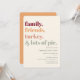 Ein einfaches Design mit Schwerpunkt auf fett formatierter Typografie in Herbstfarben, mit einem Header, der "Familie, Freunde, Truthahn und viele Kuchen" liest, beinhaltet eine Vorlage auf der Rückseite für eine zusätzliche Nachricht für Freunde und Familie.