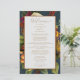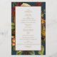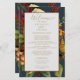 Ätherische Blumensträuße mit dunkelroten, rostigen Orangen-, Gelb- bis Goldtönen und üppiger Vegetation verleihen diesem dunklen botanischen "Welcome"-Hochzeitsprogramm ein Gefühl tiefer, reicher moderner rustikaler Eleganz, das Ihre Empfänger beeindrucken wird. Erhältlich in verschiedenen Farben. Hier mit einem aquamarinen, dunklen Hintergrund vorne und hinten dargestellt. Ändern Sie alle Vorlagenfelder, außer "Willkommen" und "und", die außer vom Designer nicht bearbeitet werden können. Composite Design von Holiday Hearts Designs (Rechte vorbehalten).