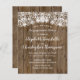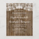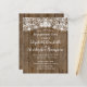 Rustikales Holzhüttenfest Einladung mit weißen Imitaten Spitzen-Trim. Eine schöne Abbildung der weißen Spitzen grenzt an die Spitze der Karte, mit den Worten die Namen der zukünftigen Braut und Bräuche in modernen weißen Kalligraphie-Stil Skript. Passendes Holzmuster auf der Rückseite.