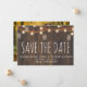 Rustikale Herbstlichter & Blätter Ankündigung Datum freihalten Postcard - mit Glaskeramikleuchten gefüllt mit glänzenden Glühwürmchen mit üppiger Garlandschaft auf einem Stallholzhintergrund. Ein Foto des glücklichen Paares wird auf der Kartenrückseite gezeigt. Der perfekte Ankündigung Datum freihalten für das Paar, das den rustikalen Stil Liebe. Save the Date wird Teil einer Sammlung sein.