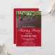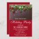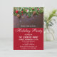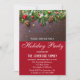 Festliche Weihnachtslandschaft Weihnachtsfeiertage mit Weihnachtsbaumzweigen, Kiefernzapfen und Rot- und Golddekorationen auf dunklem Holz. Die Details des Party sind in Weiß mit einem hellen, roten Hintergrund geschrieben. Diese rustikale Landeinladung eignet sich perfekt für einen Urlaub, Weihnachten und Winterurlaub im Party!