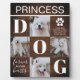 Gedenktafel für Haustiere mit 4 Fotos von Ihnen geliebten Hündchen, rustikalem Holzmuster-Hintergrund, Buchstaben, die den Hund auszeichnen, die Worte "für immer in unseren Herzen", Hunde pfoten mit einem Erinnerungszeichen Sprichwort und ihren Namen.