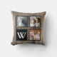Rustikales Bauernholzhinterland mit 3 Foto-Steckplätzen, schwarzen Rahmen und einem Monogramm in Weiß. Auf der Rückseite des Kissens stehen Stallholz und schwarze Hirschgeweihe mit einem Monogramm-Buchstaben.